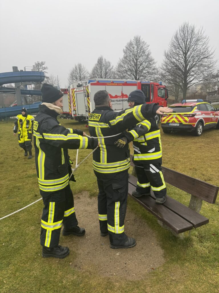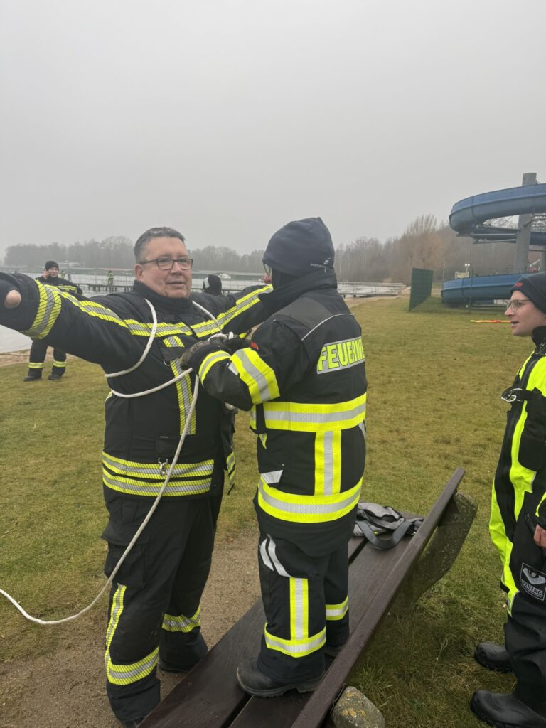 Nach einer theoretischen Einweisung, in der unter anderem Gefahren von Eisflächen sowie das richtige Vorgehen bei Eisunfällen behandelt wurden, ging es für die Kameradinnen und Kameraden zum Warener Volksbad. Dort wurde die Ausbildung auf dem Eis praktisch fortgesetzt.