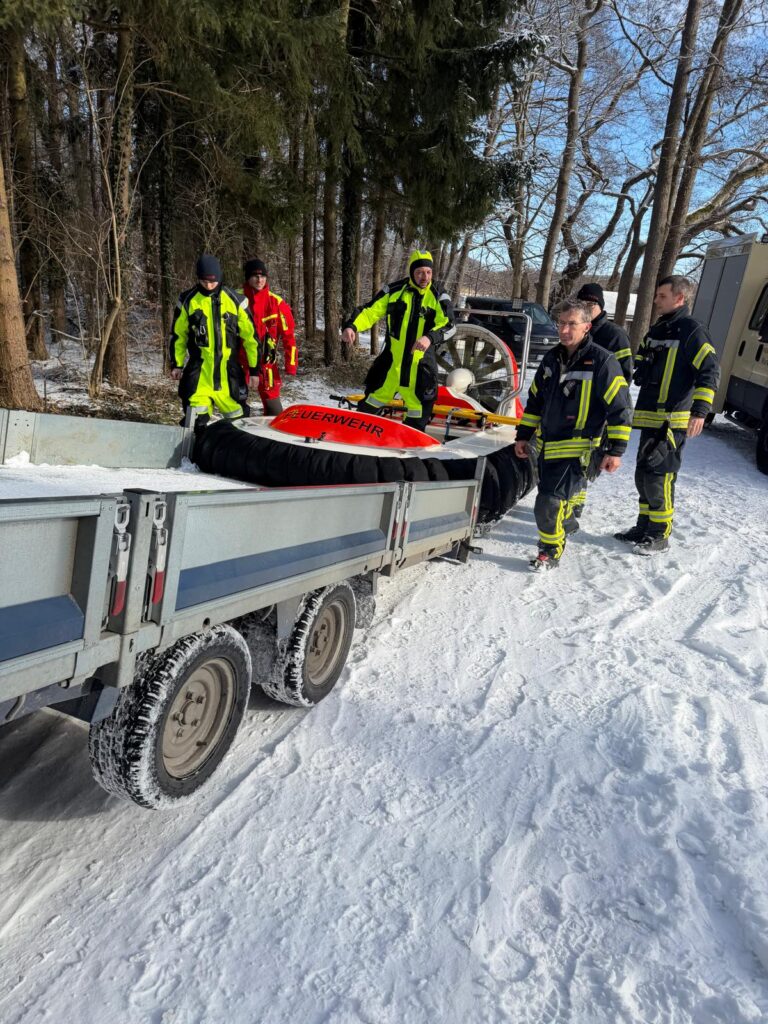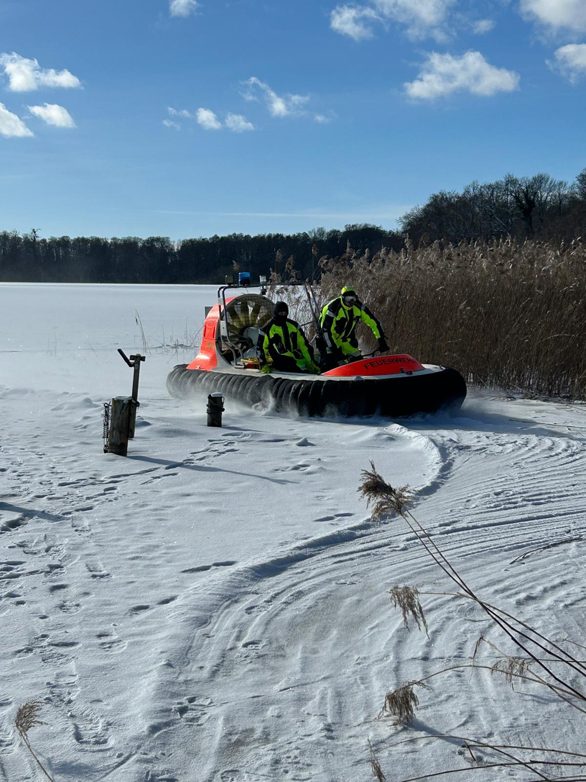 Am 15.02.2026 wurden wir zur Eisrettung auf den Torgelower See alarmiert. Ein Hund war ins Eis eingebrochen. Der Besitzer alarmierte die Feuerwehr. Mit unserem Luftkissenboot konnten wir schnell zur Einbruchstelle vordringen und den Hund retten.